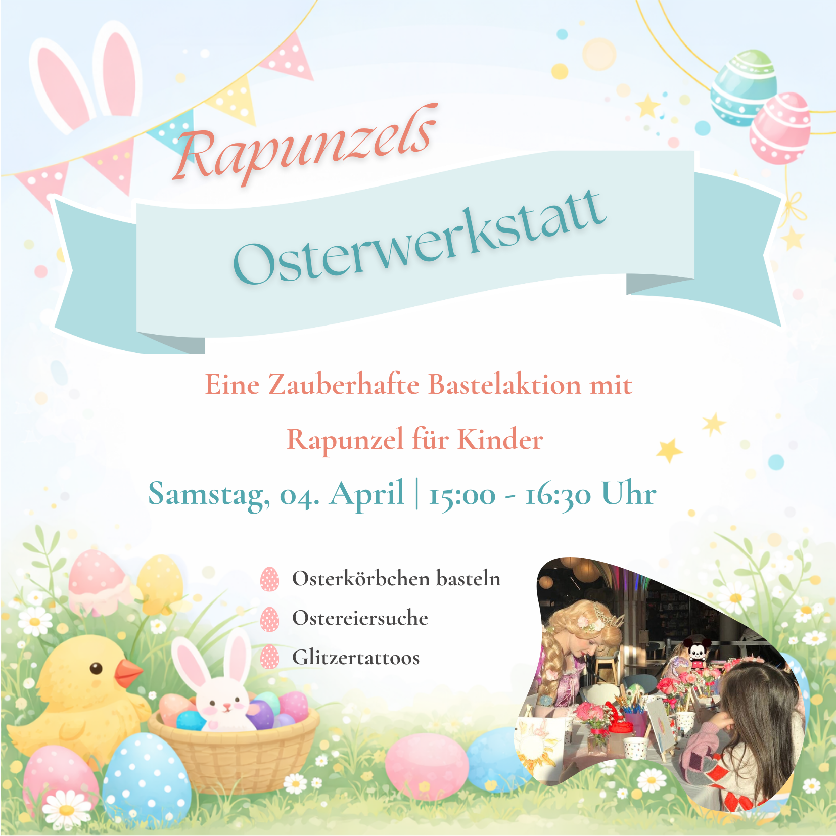 In Rapunzels Osterwerkstatt wird es bunt und kreativ! Kinder im Alter von 4 bis 7 Jahren sind herzlich eingeladen, gemeinsam mit Rapunzel fröhliche Osterkörbe zu basteln.