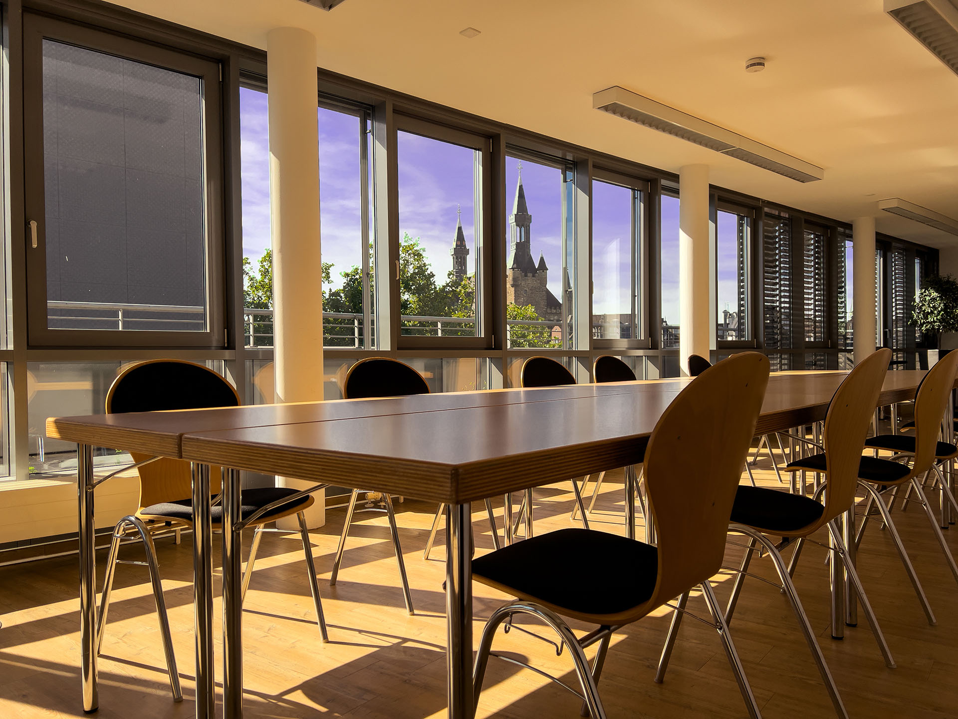 Auf 50m² können Sie hier mit bis zu 21 Personen in U-Form und 50 Personen in Reihenbestuhlung tagen oder kleine Vorträge abhalten. Auch hier stehen Ihnen Beamer, Leinwand und WLAN zur Verfügung. Eine helle und freundliche Atmosphäre und der spektakuläre Ausblick auf die Aachener Altstadt mit dem Dom im Vordergrund, machen diesen Raum einzigartig.