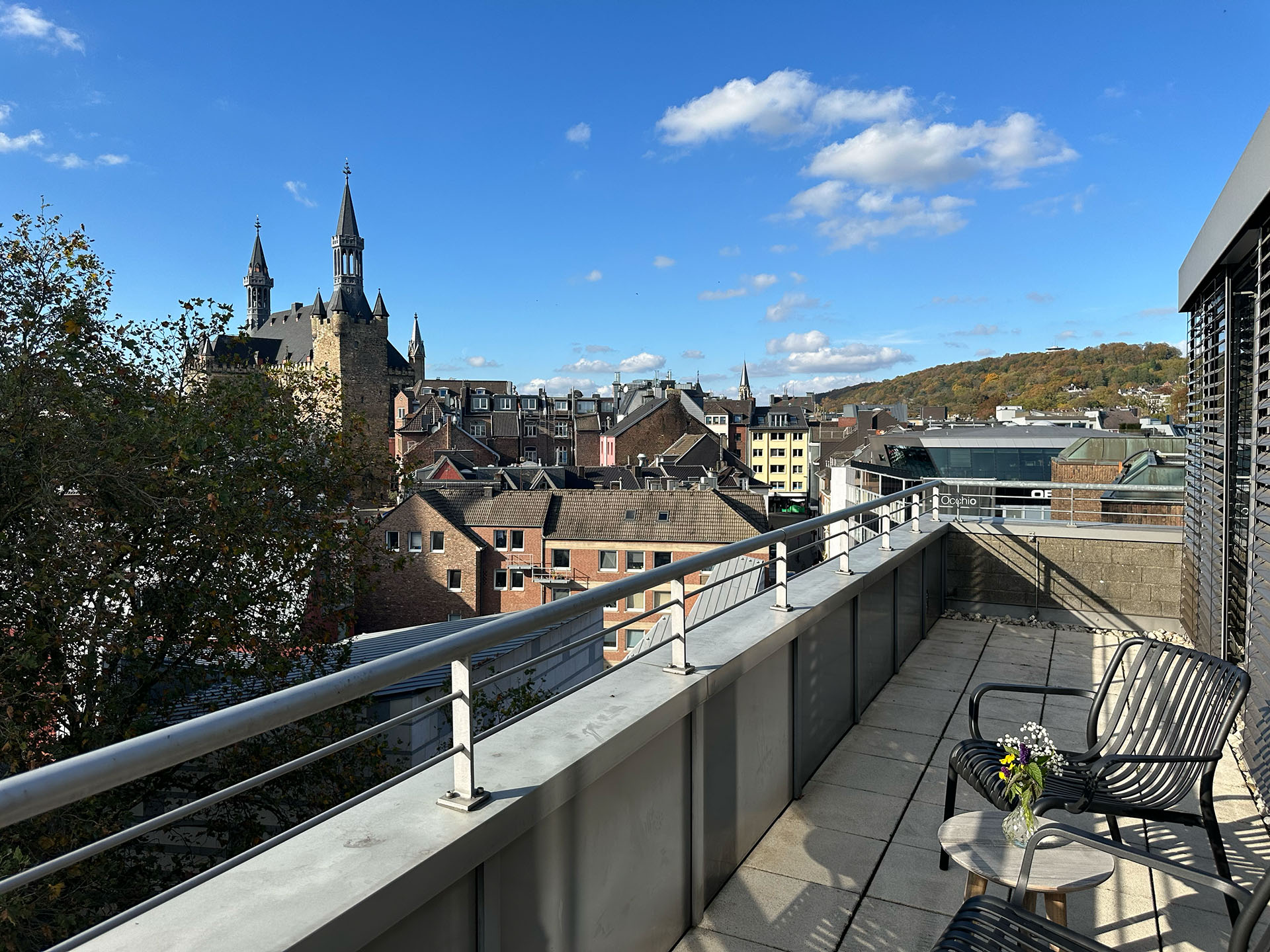 Zudem verfügt der Raum über einen eigenen Balkon mit Blick auf die Altstadt. Rathaus, Lousberg und Elisenbrunnen können Sie hier aus einer völlig neuen Perspektive erleben. Der Rathausblick-Raum eignet sich auch für kleine Empfänge und Feiern mit bis zu 50 Personen.