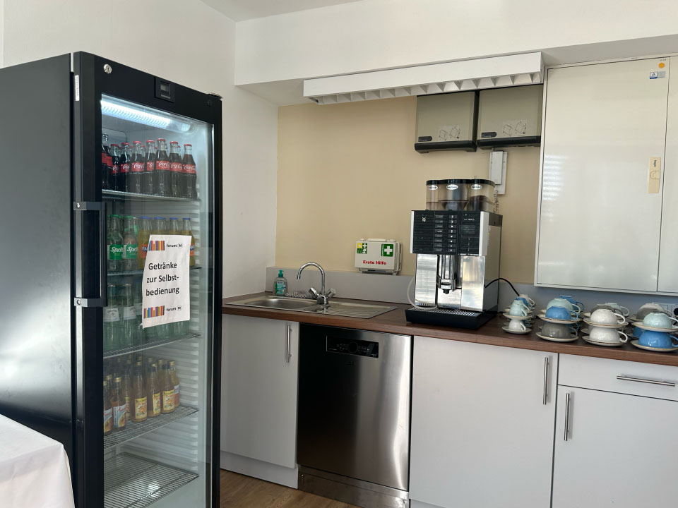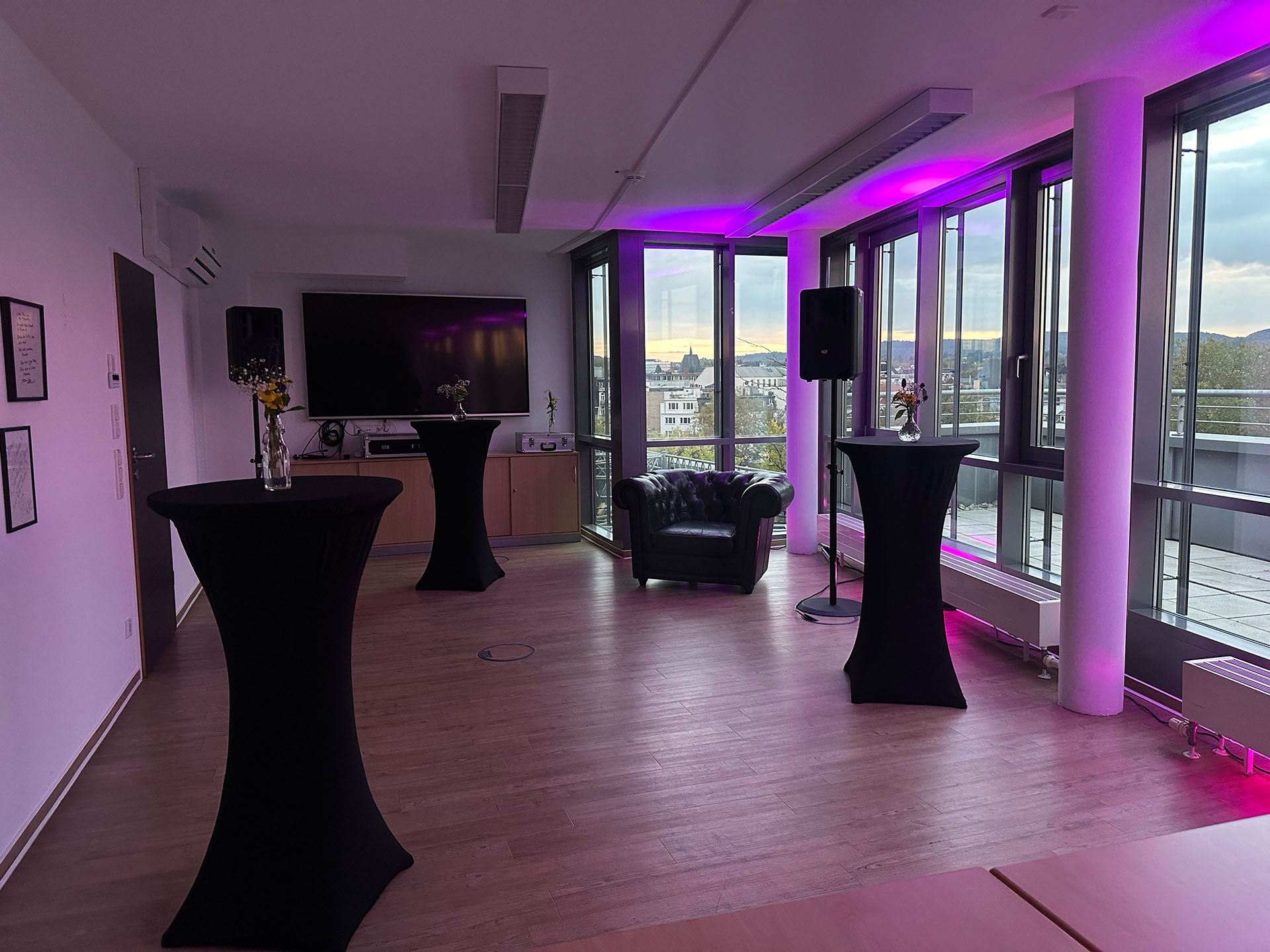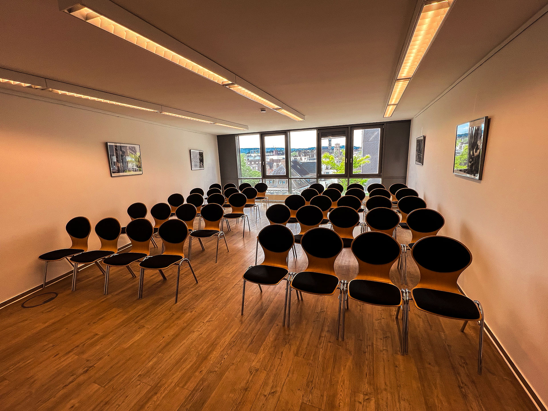 Unser neuester Konferenzraum ist sehr vielseitig nutzbar. Bis zu 27 Personen an Tischen und 45 Personen in einer Reihenbestuhlung finden hier Platz. Ihnen stehen auf 70m² auch eine kleine Teeküche mit WMF Kaffeevollautomat zur Verfügung.